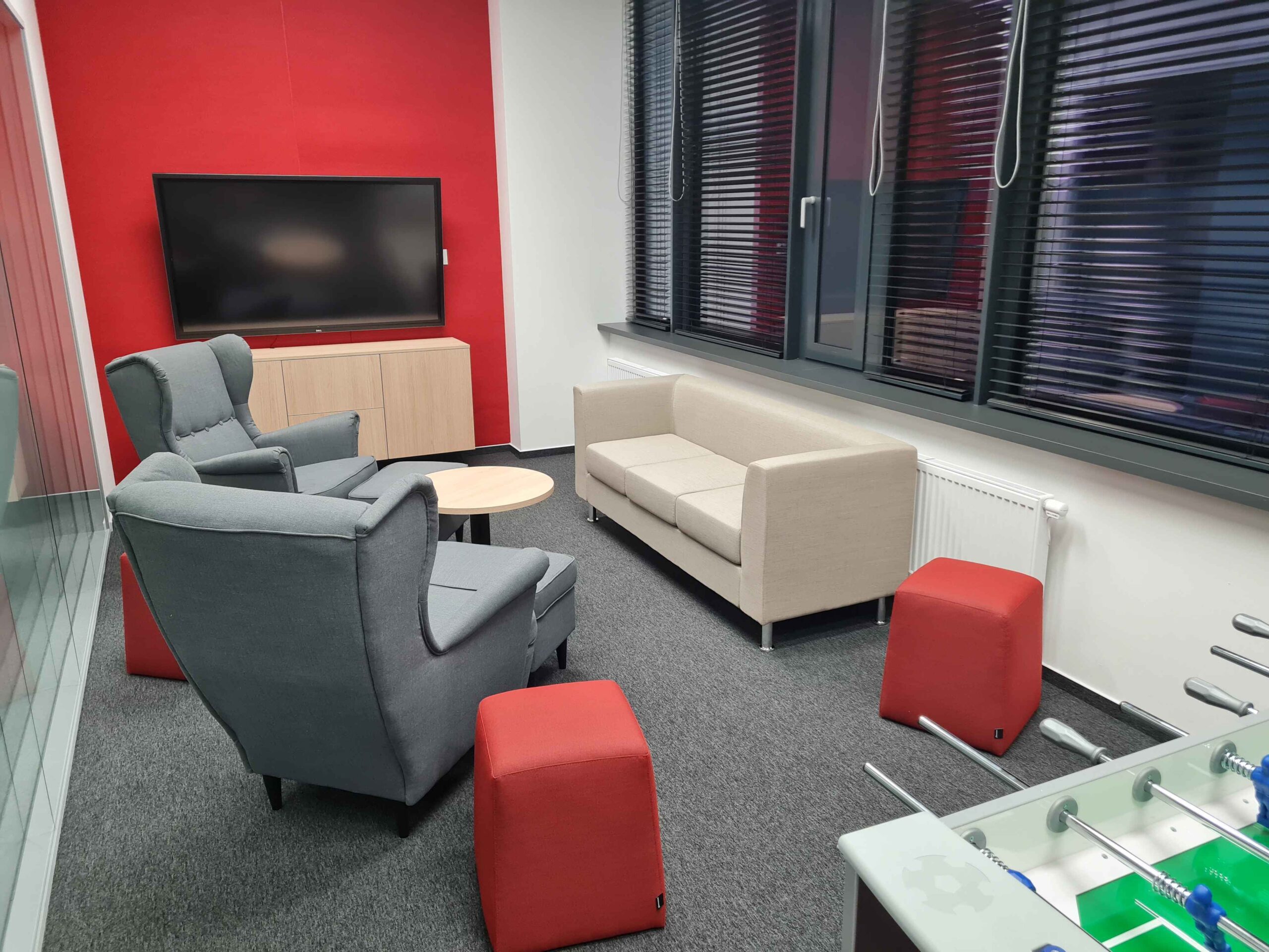 Relaxačná zóna s červenými akcentmi, pohodlnými sedačkami a stolným futbalom dokresľuje obraz kancelárie, v ktorej sa ľuďom nielen dobre pracuje, ale aj sa tam dobre cítia.