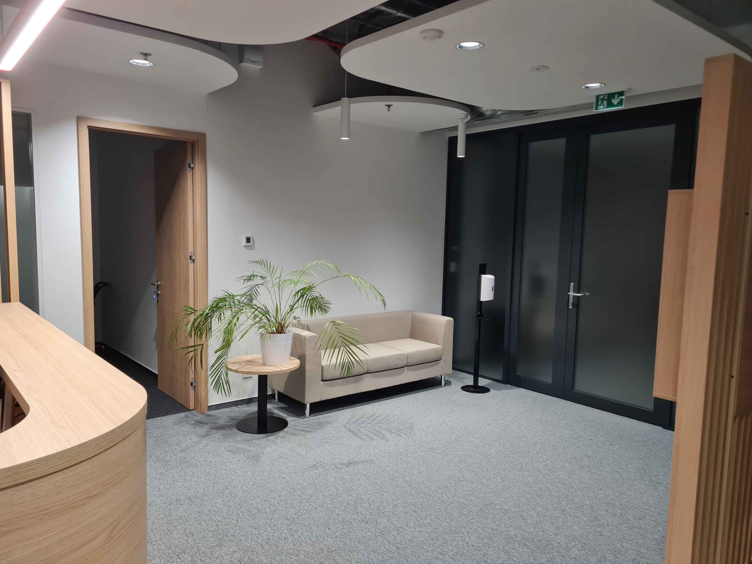 Dodali sme kompletné vybavenie pre 60 pracovníkov vrátane výškovo nastaviteľných stolov, kontajnerov, stoličiek a lockrových skriniek. Pre šesť zasadačiek sme navrhli a realizovali riešenia zodpovedajúce rôznym potrebám – od menších porád až po väčšie stretnutia. Atypový nábytok zahŕňal recepciu, dve kuchynky, vstavané skrine a lamelové steny, ktoré priestoru dodávajú hĺbku a teplo.