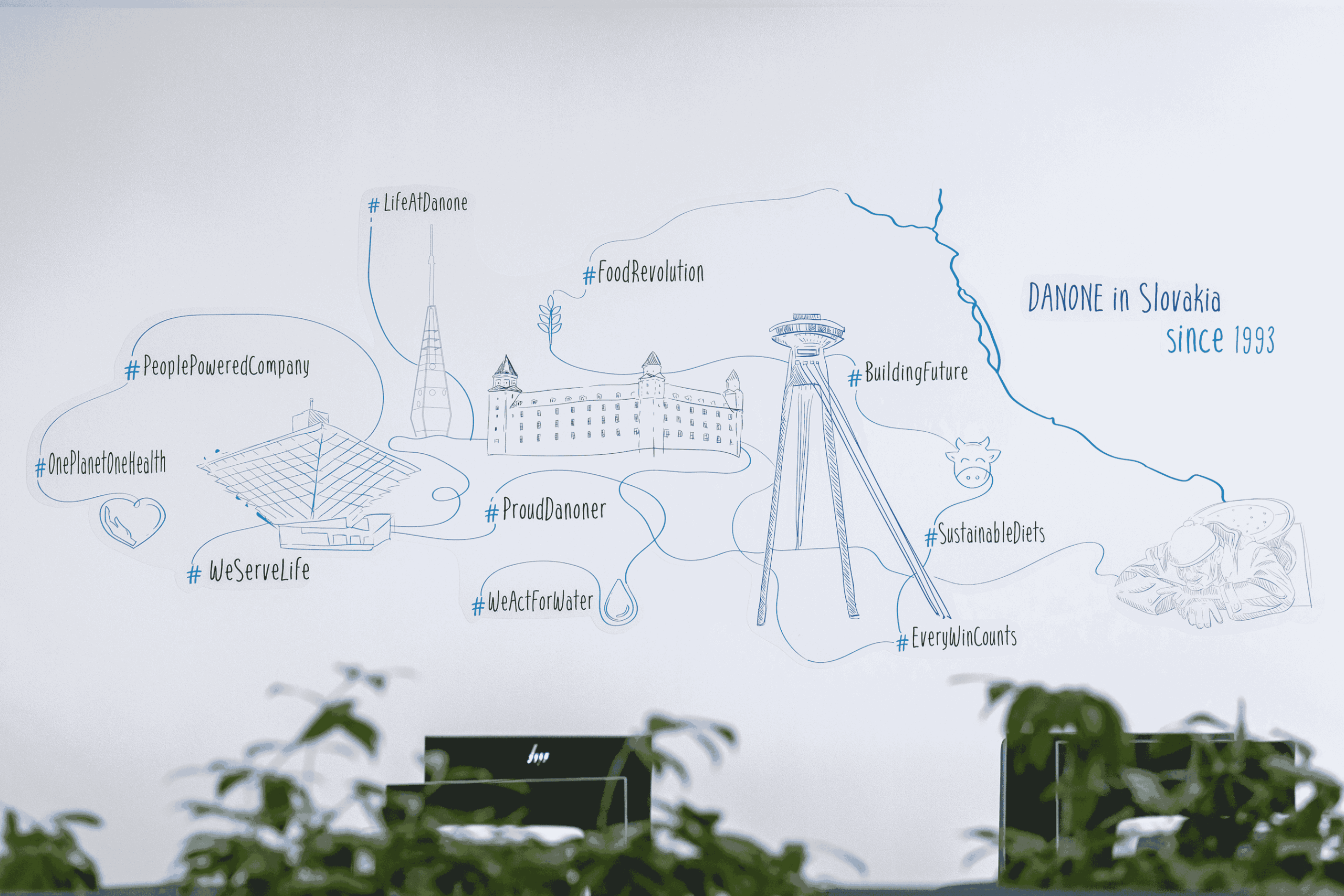 Cieľom projektu bolo vytvoriť kompaktné, efektívne a vizuálne čisté kancelárske prostredie, ktoré podporí spoluprácu tímu a zároveň bude odrážať hodnoty značky Danone. Priestor mal ponúknuť dostatok zasadacích miestností, komfortné pracovné stanice aj neformálne lounge zóny.