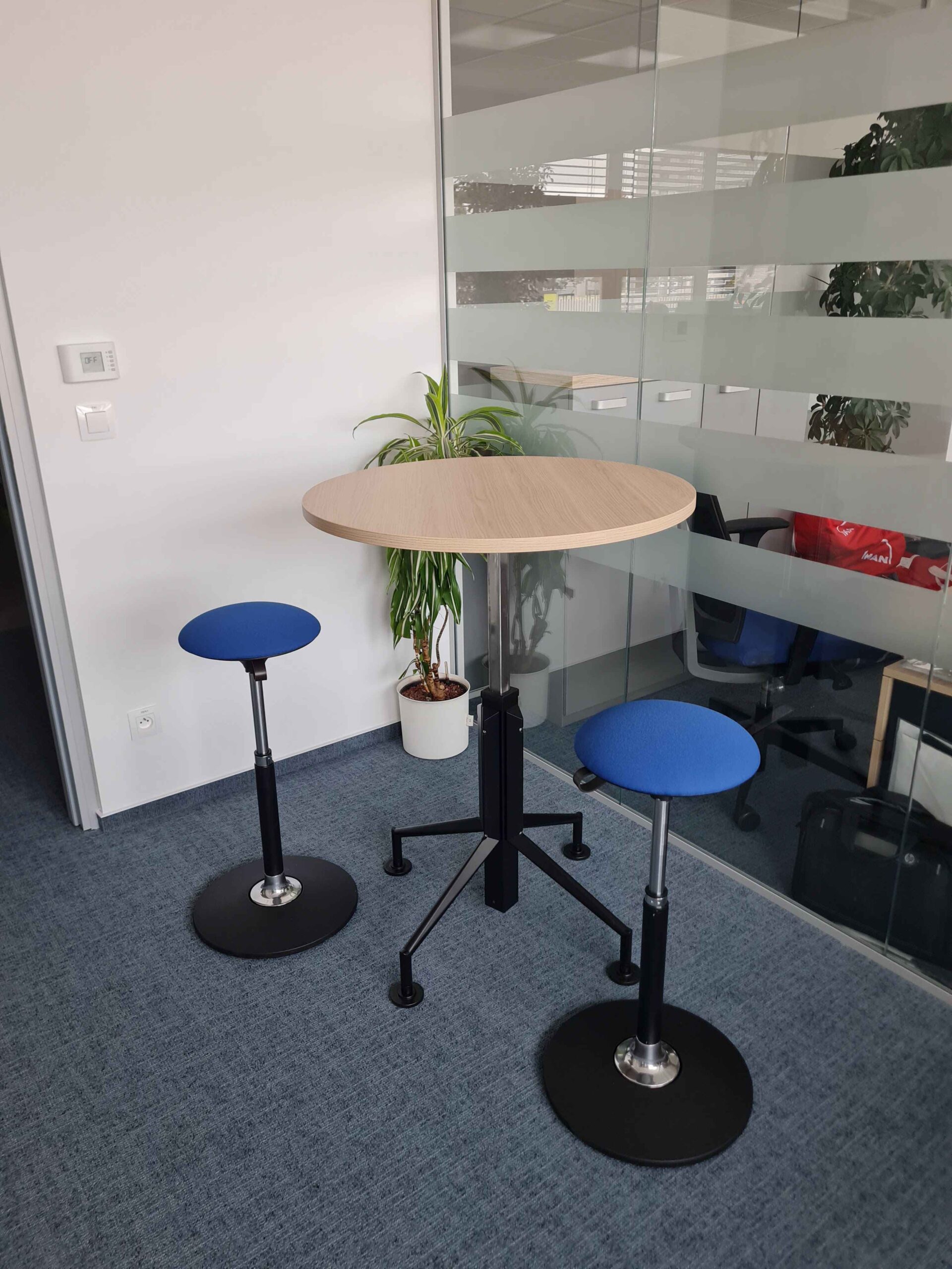 Klient dostal kompletne obnovené pracovné prostredie, ktoré navonok pôsobí ako čistá rekonštrukcia, no v skutočnosti kombinuje premyslene vybraný nový nábytok s repasovanými kusmi. Výsledok je vizuálne jednotný, moderný a plne zodpovedá korporátnej identite značky.